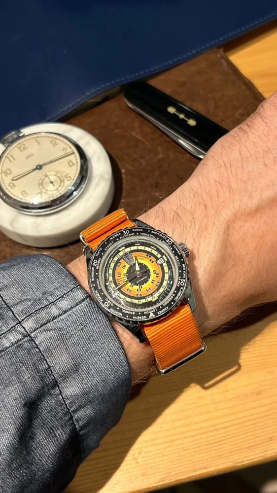 "Yani '2024 Yaz Saatim' benim 2023 yaz saatim, çünkü şu anda 'yeni saat yok' durumundayım. Bu saat (derin bir nefes) Mido Ocean Star Decompression Worldtimer, kadranına uyması için üçüncü parti turuncu bir NATO kayış taktım. Yoğun rotasyonda çünkü renk cümbüşü bana çocuksu bir neşe veriyor. Bu saati modern saatler arasında görece silik olduğu için seviyorum-özellikle de perakende satışının yapılmadığı burada [Birleşik Krallık'ta]. Worldtimer'ı kullanıyor muyum? Pek kullanmıyorum. Dekompresyon ölçeklerini? Tanrım, umarım kullanmam. Bu onun cazibesini azaltıyor mu? Hiç de değil."