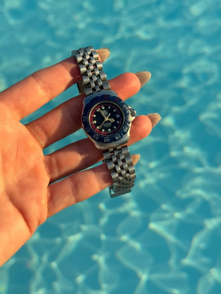 "Benim mükemmel yaz saatim vintage, minicik bir TAG. Yeniden piyasaya sürüldüğünden beri bunlar altın oldu ve bu mavi-kırmızı denizci numarasını bulduğum için çok mutluyum. Cornwall'da ailece vakit geçirirken ya da Positano'da bir teknenin yanından dalış yaparken kullanabileceğim kadar sevilen bir saat. Ayrıca bu saatle Avrupa'da seyahat etmekten, yanlış türden bir ilgi çekmekten ziyade saat dünyasının ileri gelenlerine arsızca göz kırpmaktan mutluluk duyuyorum."