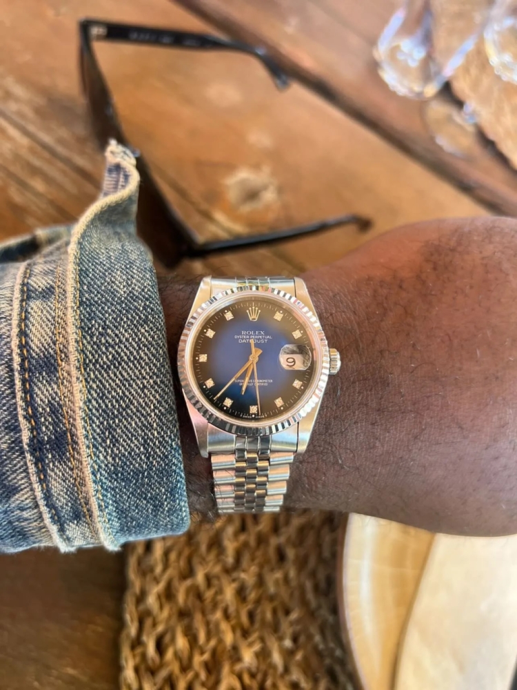 "Günlük yazlık kıyafetim Doğum Yılı Rolex Datejust ref. 16234. Beni en çok çeken şey mavi vinyet kadranı oldu. Saat hayranları arasında harika bir konuşma parçası ve çoğu eski Rolex'ten daha az sıradan. Elmaslar sonradan edinilen bir zevk ama sessiz bir lüks dokunuşu katıyor.
